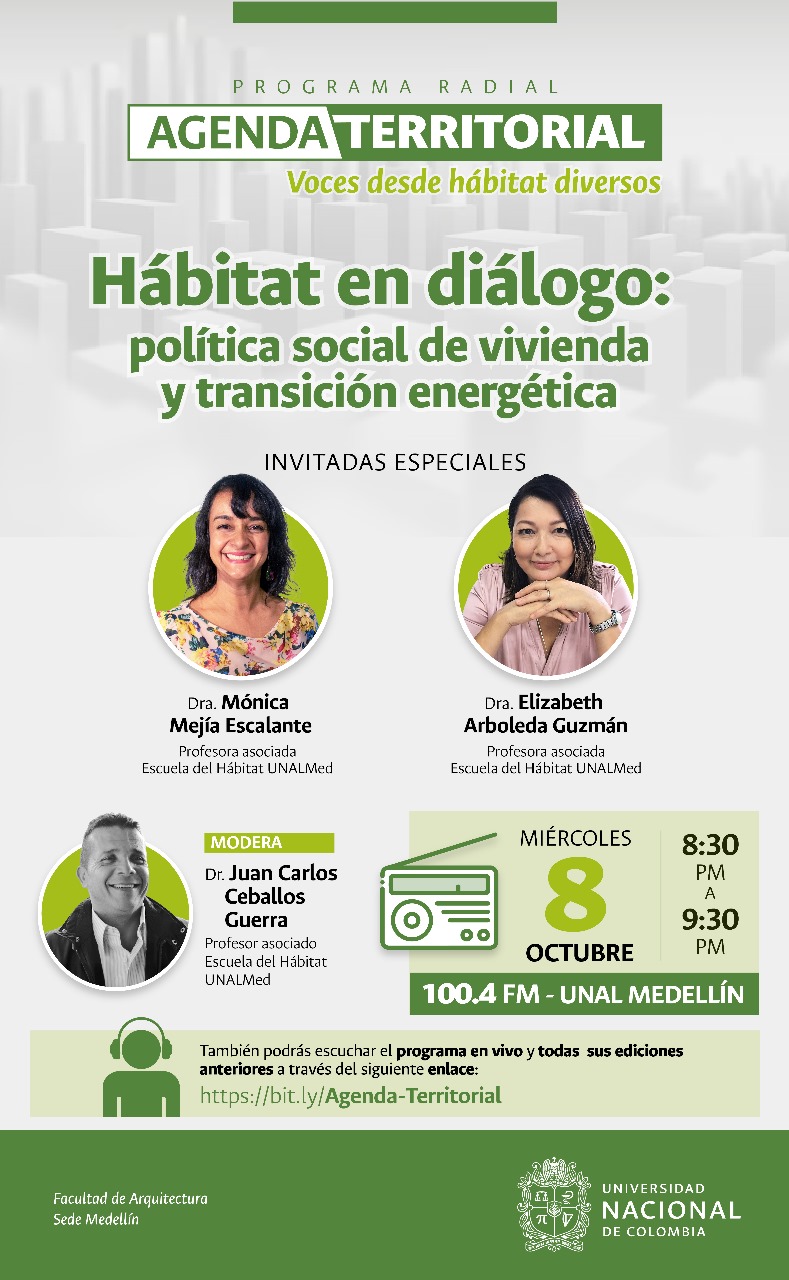 Hábitat y diálogo: Política social de vivienda y transición energética Invitadas Especiales: Dra Elizabeth Arboleda Guzmán. Profesora Asociada, Escuela del Hábitat -CEHAP- UNALMed Dra Mónica Mejia Escalante. Profes... Leer más
