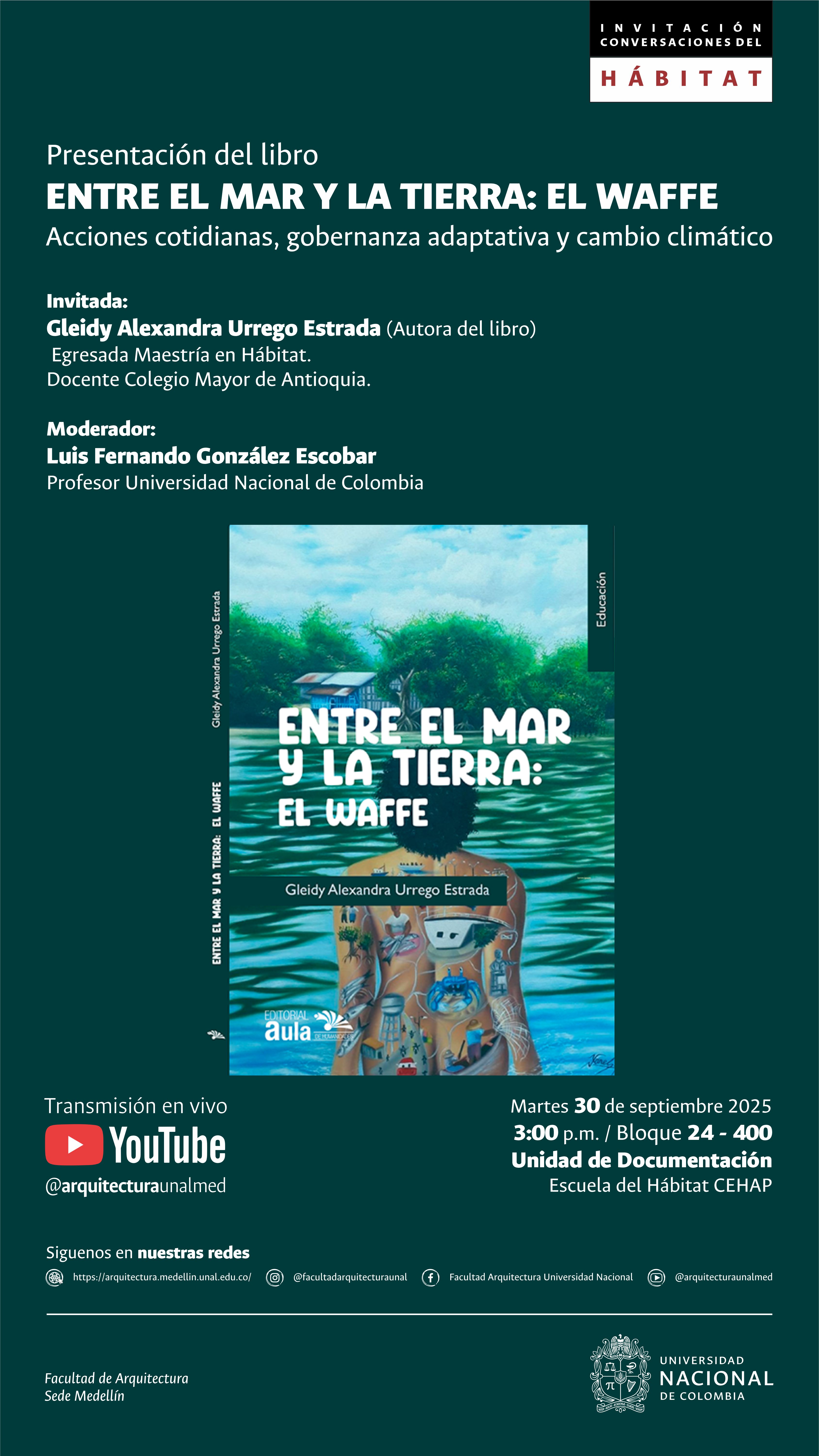 Presentación del libro: ENTRE EL MAR Y LA TIERRA : EL WAFFE. Acciones cotidianas, gobernanza adaptativa y cambio climático. Invitada: Gleidy Alexandra Urrego Estrada. (Autora del Libro) Egresada Maestría en Hábitat. Docente Col... Leer más